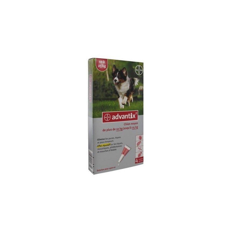 Advantix Chien Moyen 4 Pipettes (pour les chiens de 10 jusqu’à 25kg) est un antiparasitaire large spectre d’action répulsive et létale.