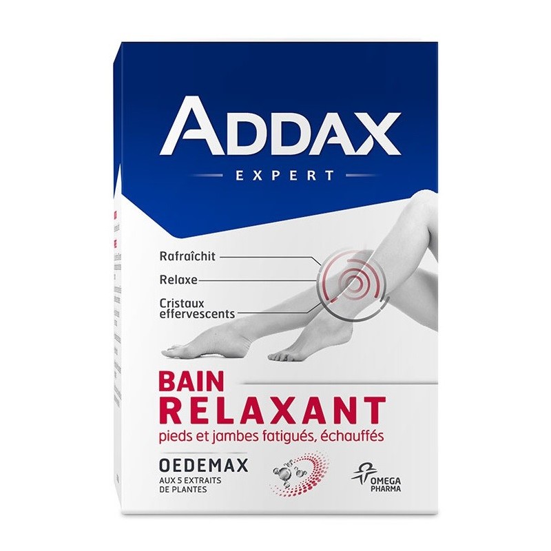 Addax Oedemax Bain Relaxant Pieds et Jambes 8 Sachets sous forme de cristaux effervescents, sont recommandés en cas de pieds et jambes fatigués, échauffés. Ces cristaux permettent un bain de pieds relaxant, apaisant et rafraîchissant. Efficaces grâce à leur formule, ces cristaux regroupent 5 extraits de plantes reconnus pour leurs propriétés :
