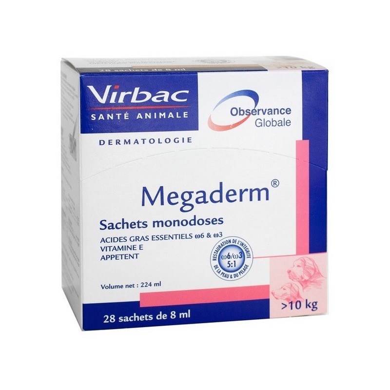 Virbac Megaderm 28 Sachets de 8 ml est un supplément nutritionnel appétent pour chiens. Ce sont des acides gras essentiels et des vitamines. Présenté sous forme de sachets monodoses, le complément Megaderm Virbac est indiqué en dermatologie, il permet de maintenir l'équilibre cutanée et de diminuer les réactions inflammatoires au niveau de la peau lors de dermatites atopiques notamment, allergies et désordres kérato-séborrhéiques.
