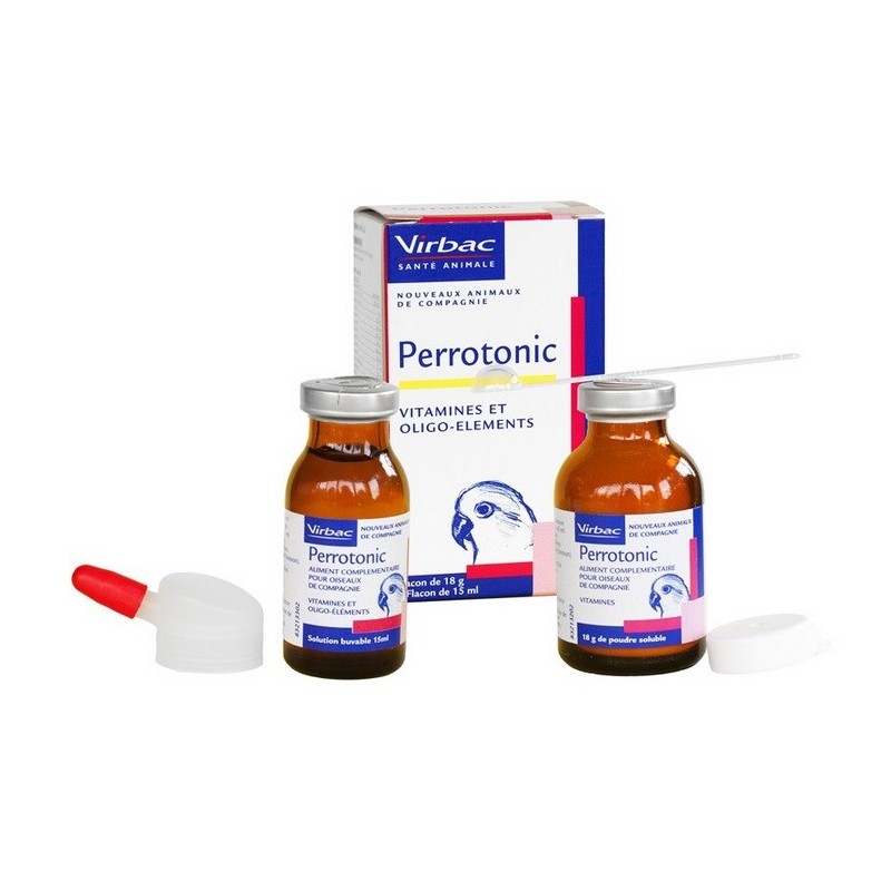 • Virbac Perrotonic, donné régulièrement, apporte l’ensemble des vitamines, oligo éléments et minéraux pouvant faire défaut dans l’alimentation à base de graines des perroquets et perruches.