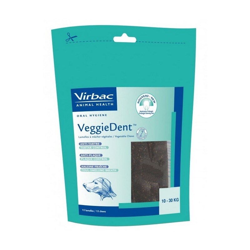 Virbac VeggieDent M (chien de 10 à 30 kg) est un aliment complémentaire, antiplaque, anti-tartre et favorisant une haleine fraiche chez le chien.