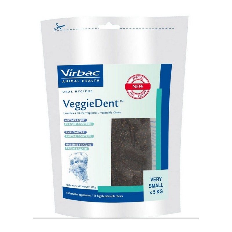Virbac VeggieDent XS (chien de moins de 5 kg) est un aliment complémentaire, antiplaque, anti-tartre et favorisant une haleine fraiche chez le chien.