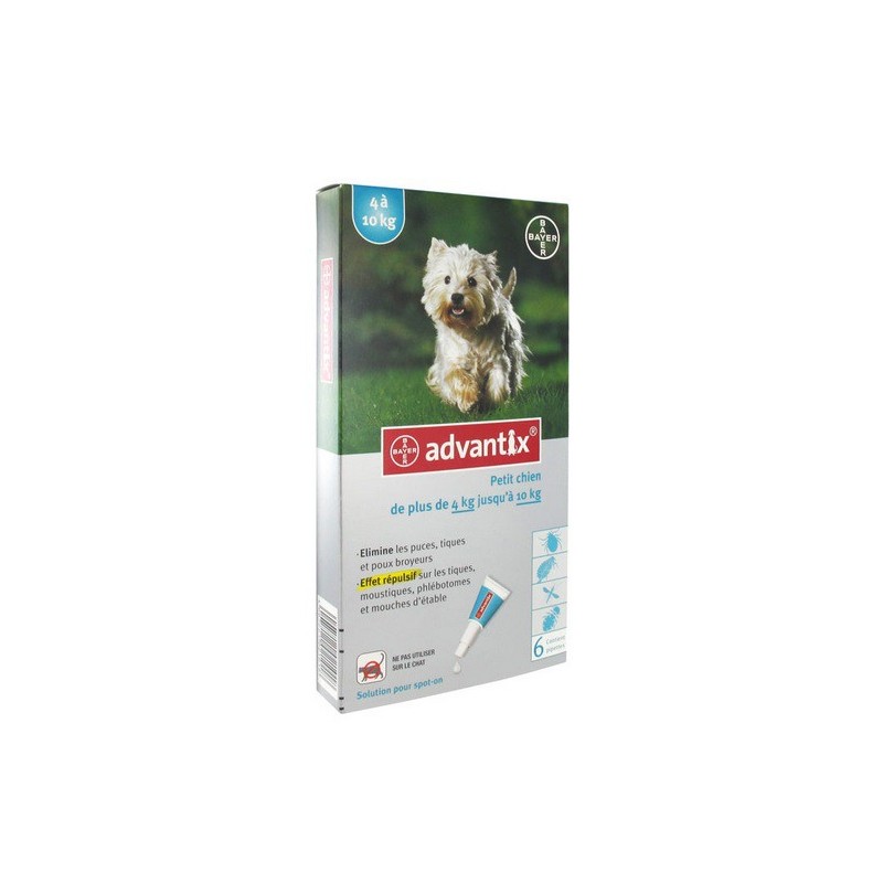 Advantix Petit Chien 6 Pipettes (pour les chiens de 4 jusqu’à 10kg) est un antiparasitaire large spectre d’action répulsive et létale.