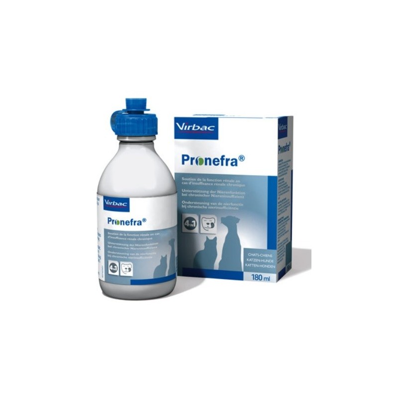 Virbac Pronefra 180 ml est un soutien de la fonction rénale en cas d'insuffisance rénale chronique chez le chat ou le chien.