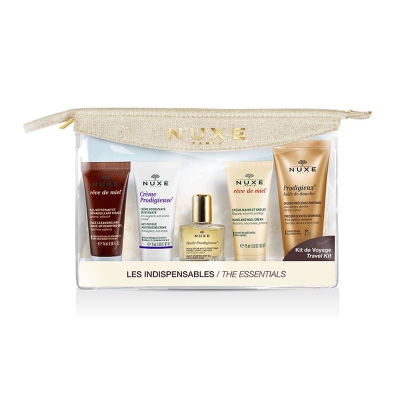 La Trousse de Voyage Nuxe contient 1 Prodigieux huile de douche 30 ml, 1 Eau Démaquillante Micellaire aux Pétales de Rose 35 ml, 1 Huile Prodigieuse 10 ml, 1 Prodigieux le parfum 1.2ml, 1 Crème Fraîche de Beauté Peaux Normales 15 ml et 1 Rêve de Miel Crème Corps Ultra-réconfortante 30 ml.