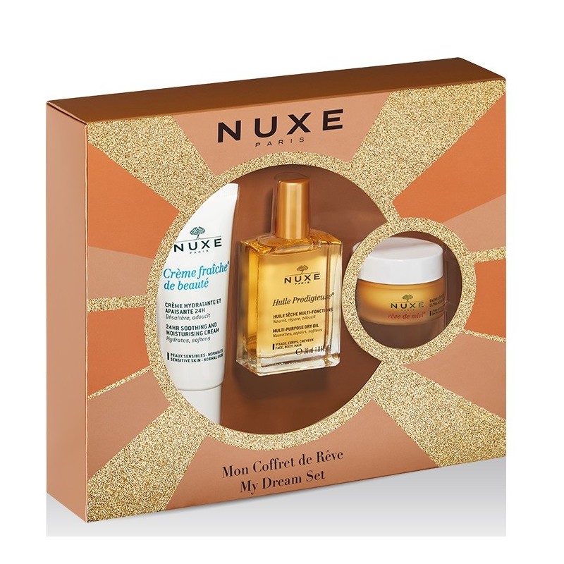 Nuxe Mon Coffret de Rêve vous dévoile ses trésors de beauté avec 3 soins "Stars", véritables produits cultes de la marque : L'inimitable Huile Prodigieuse nourrit, répare et sublime le visage, le corps et les cheveux. L'incontournable Crème Fraîche de Beauté hydrate, apaise et adoucit le visage. Le cultissime Baume Lèvres Ultra-Nourrissant Rêve de Miel nourrit, répare, apaise et protège les lèvres.