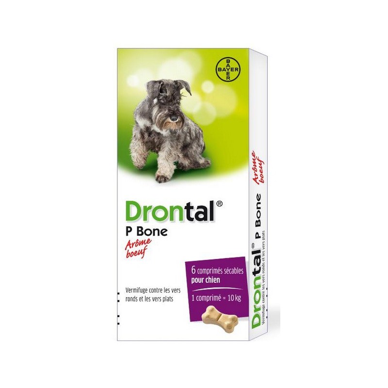 Drontal P Bone 6 Comprimés est un vermifuge complet à large spectre contre les vers ronds et plats des chiens à partir de 2kg. Les comprimés, aromatisés au boeuf et sécables, s'administrent facilement et ont une bonne tolérance pour toutes les races de chien.