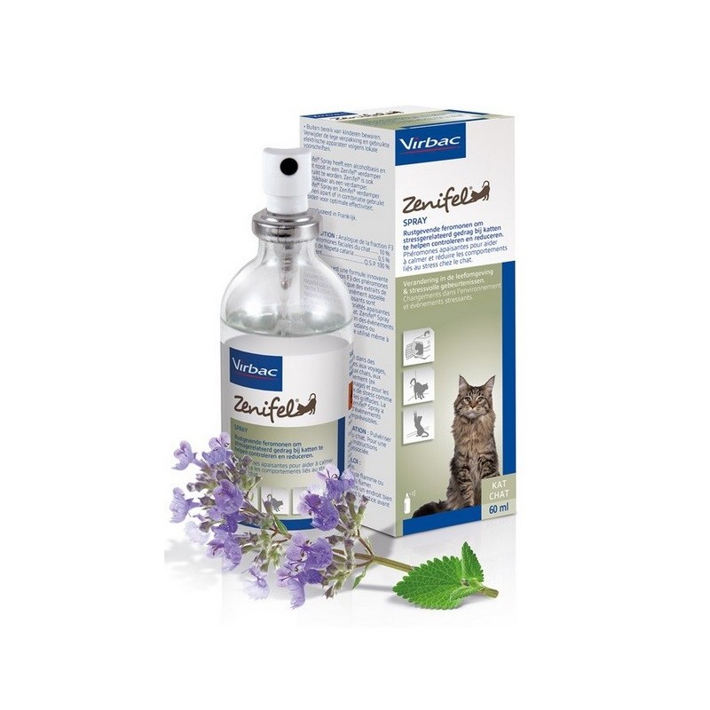 • Virbac Zenifel Spray est une formule innovante contenant un analogue de la fraction F3 des phéromones faciales félines ainsi que des extraits de Nepeta cataria, communément appelée herbe à chat. Ces composants sont reconnus pour leurs propriétés apaisantes et rassurantes chez le chat.