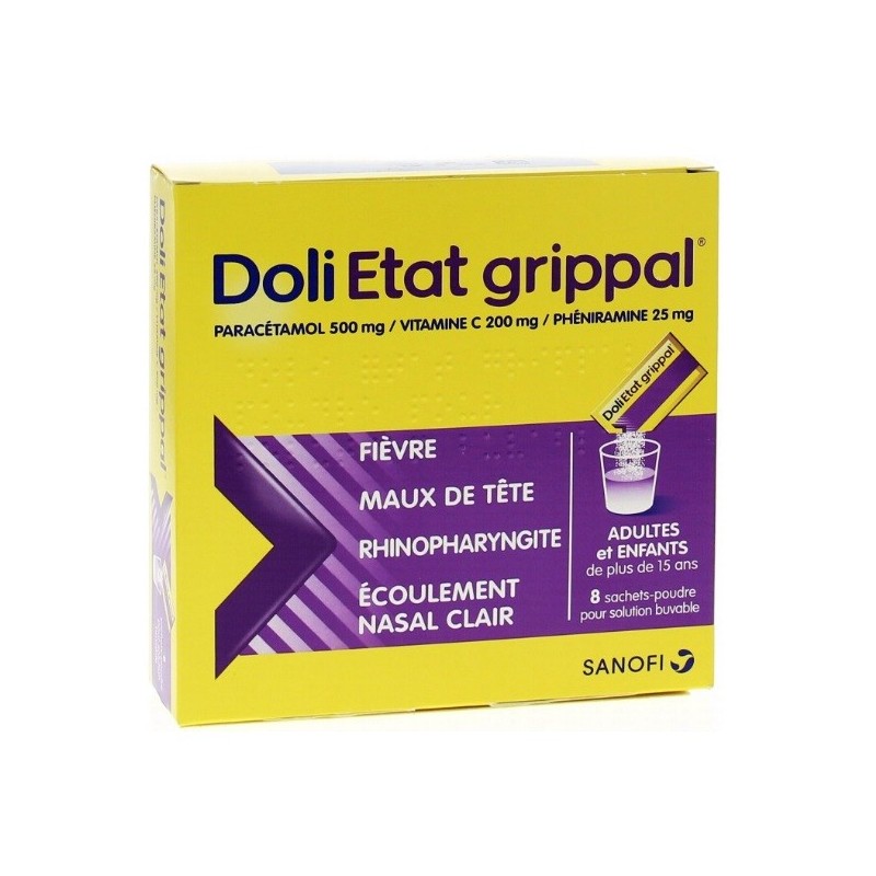 Doli Etat Grippal 8 Sachets-Poudre est un médicament est indiqué chez l’adulte et l’enfant de plus de 15 ans dans le traitement au cours des rhumes, rhinites, rhinopharyngites et des états grippaux :