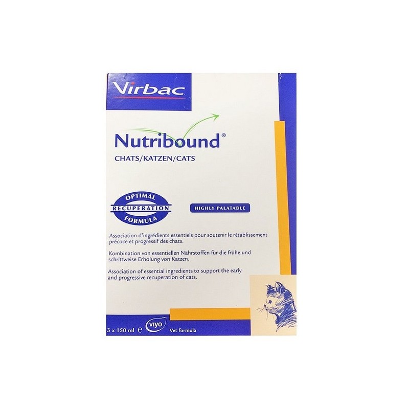 • Virbac Nutribound Chats est une solution orale très appétente et prête à l’emploi qui stimule la prise alimentaire et la prise de boisson jusqu'à la reprise de l'alimentation habituelle.